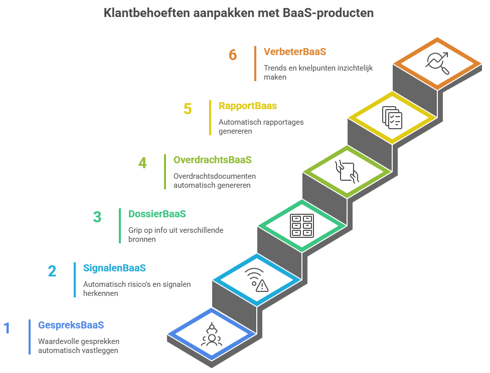 We hebben onze bots georganiseerd rond de zes belangrijkste fases van klantinteractie in het sociaal domein. Samen vormen ze de BaaS-lijn: van de GespreksBaaS tot de VerbeterBaaS. Elk met een helder doel, ieder met directe impact voor professionals.